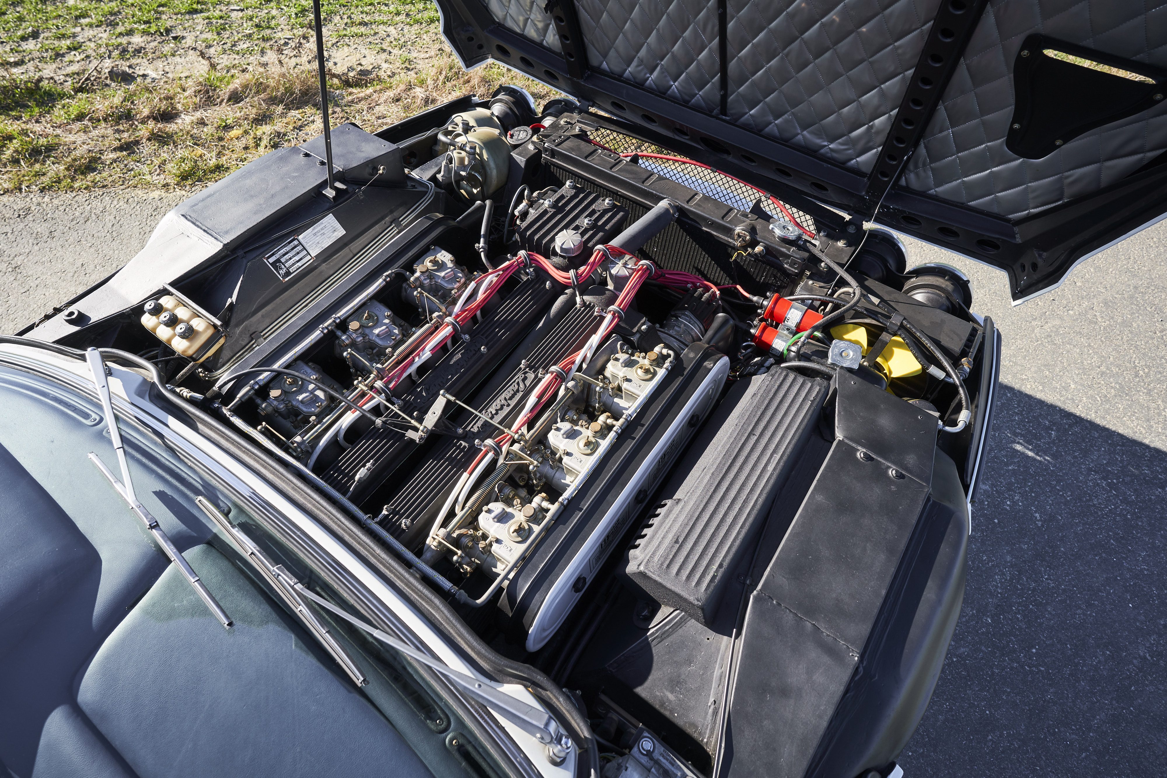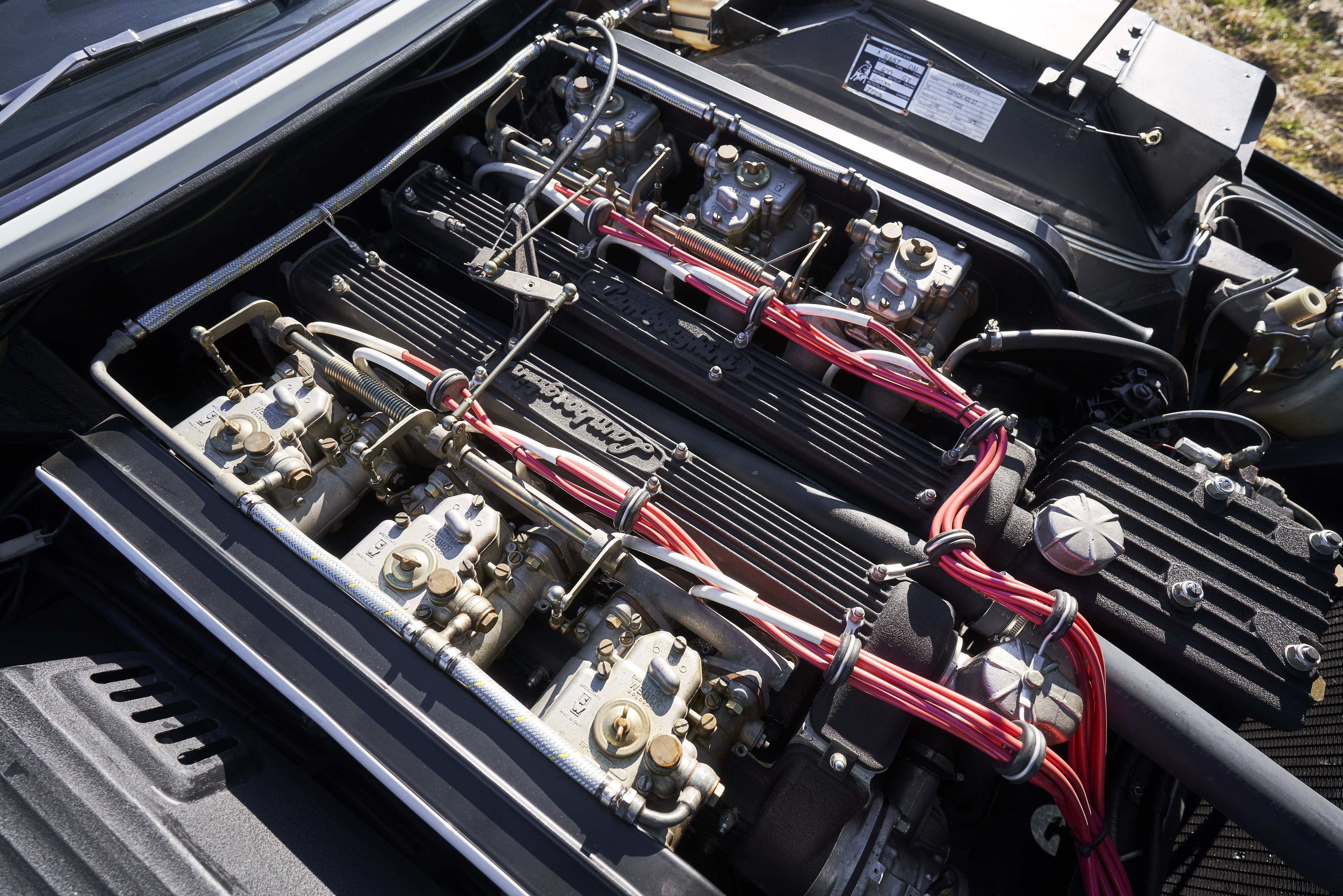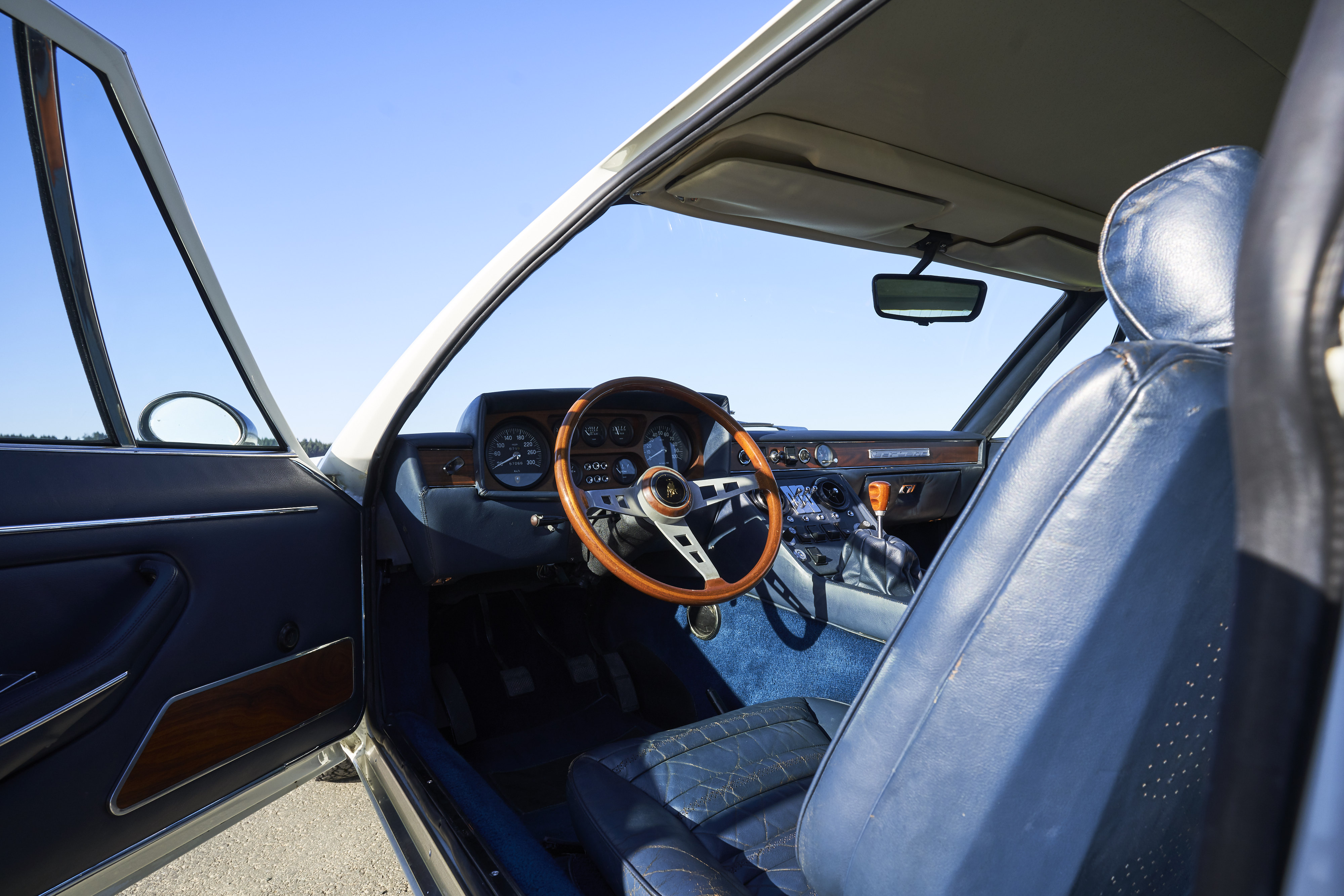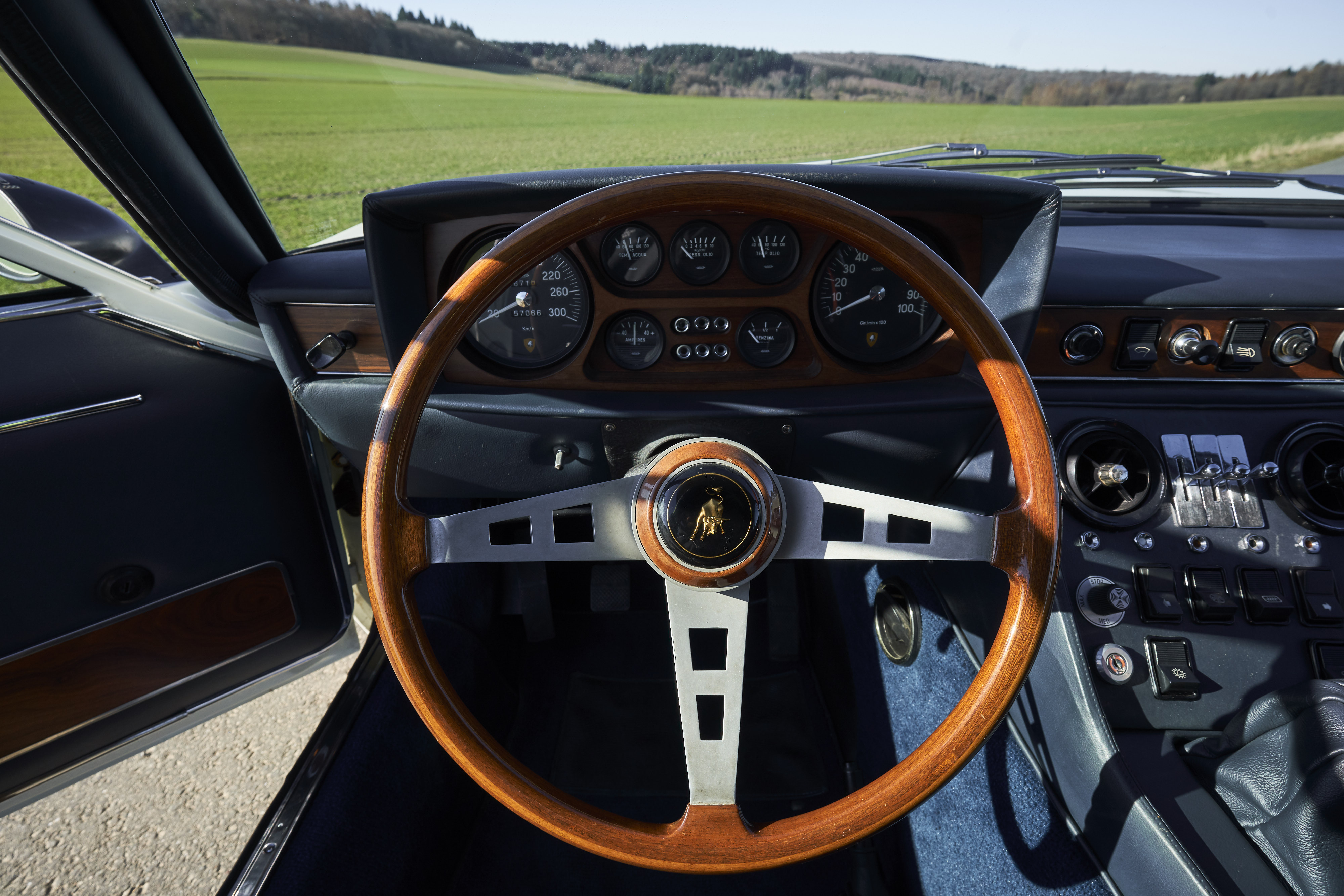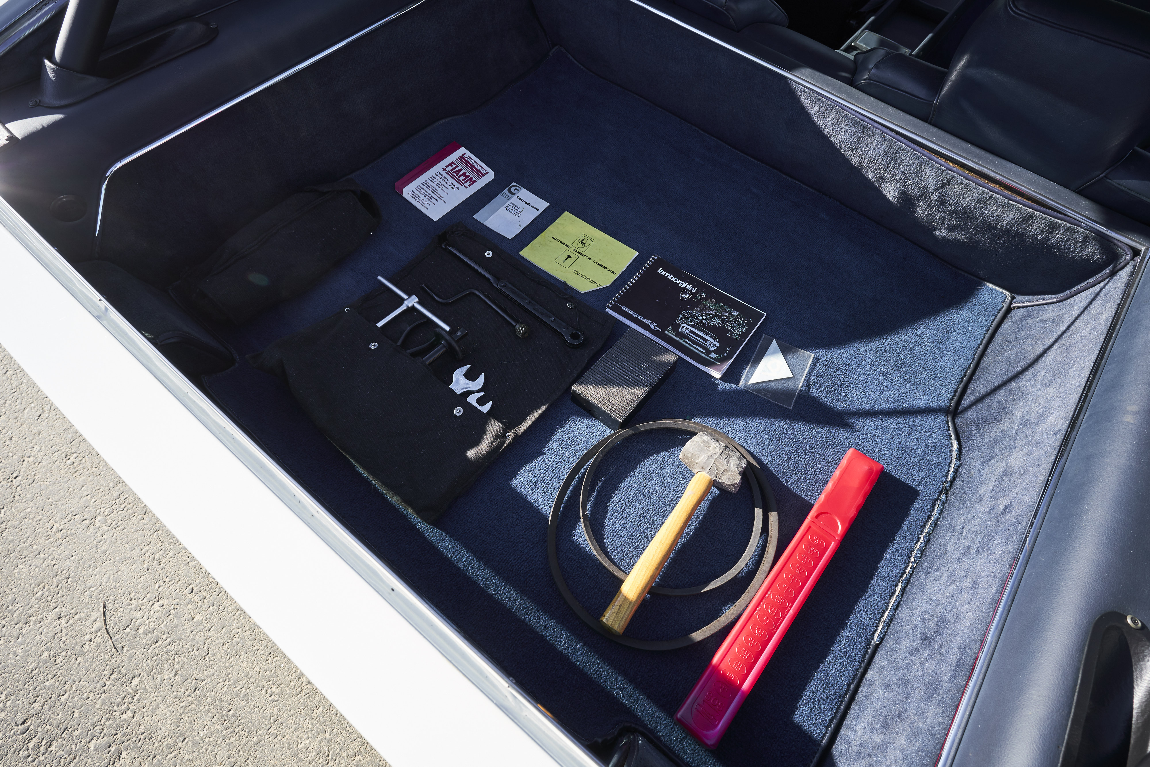 Since the car was rarely driven in the last years in the possession of the first owner, the current owner decided to have it restored completely but with an eye for originality. The work was carried out by a well-known German Lamborghini specialist. The body was sanded down to the sheet metal and the paint was rebuilt from scratch. All technical components were disassembled down to the last screw, cleaned, checked, reconditioned or replaced with original parts when required. The original leather trim of the car could be saved (with the foam underneath being replaced). As the leather was in excellent, well-preserved condition and showed an attractive and tangible degree of patina, it was carefully cleaned, re-stitched if necessary and then conserved for this truly exceptional vehicle. The car was also found to be exceptionally original before restoration and still had the original matching engine. All the work carried out is well documented with available invoices. A photo album of the restoration work also exists. In addition to the original Italian libretto mentioned above, the exceptionally rare original owners manual, tool kit and jack are included.