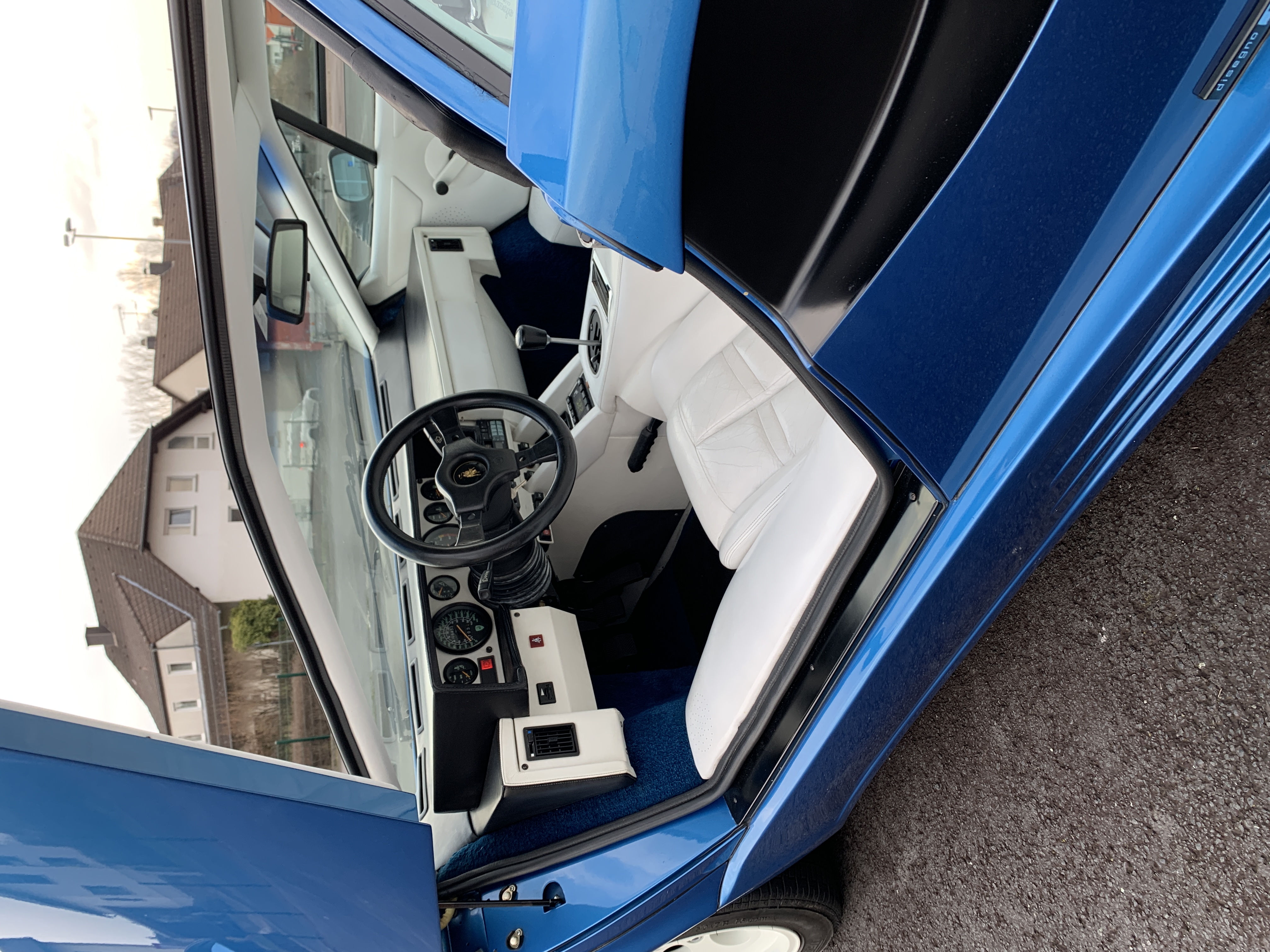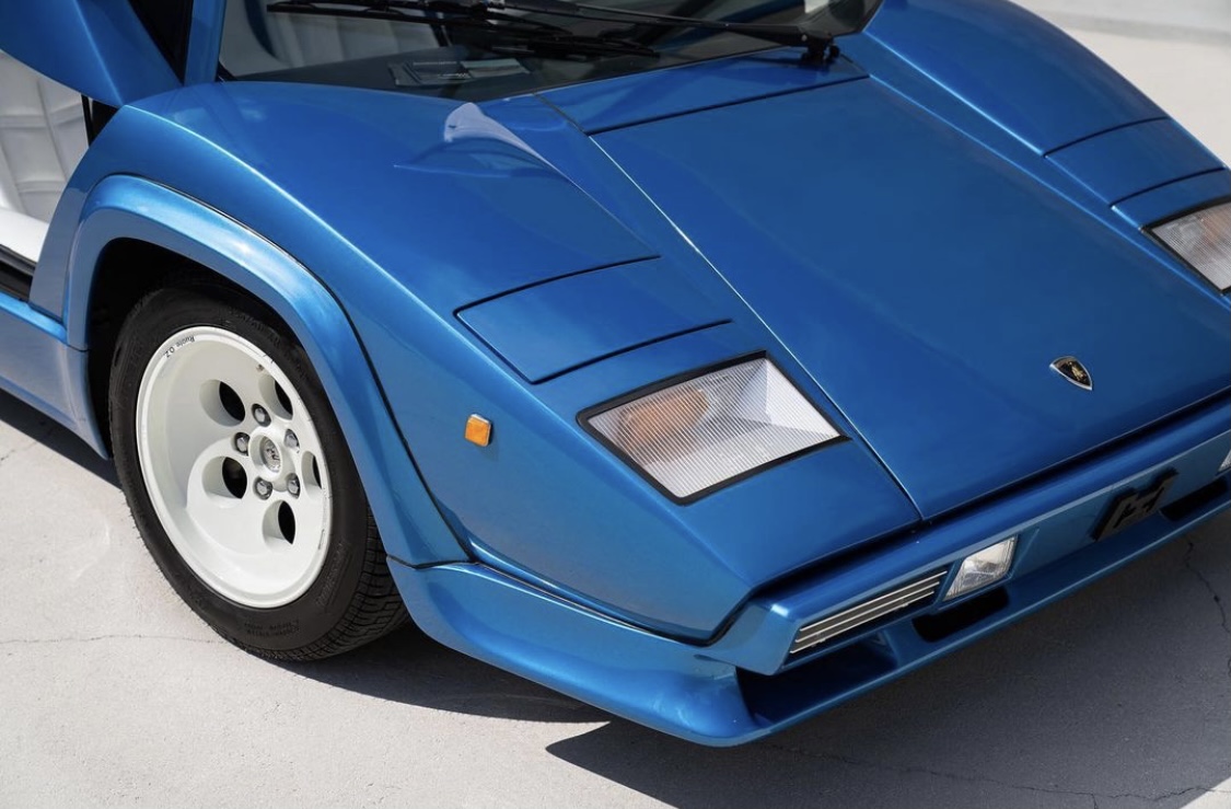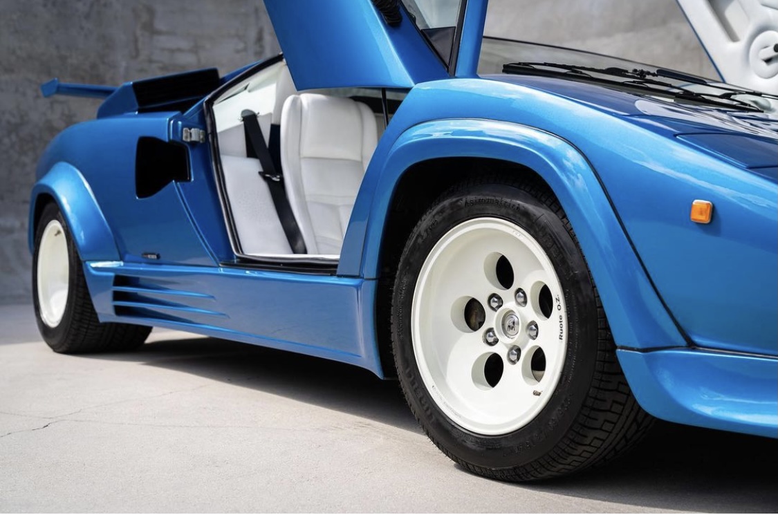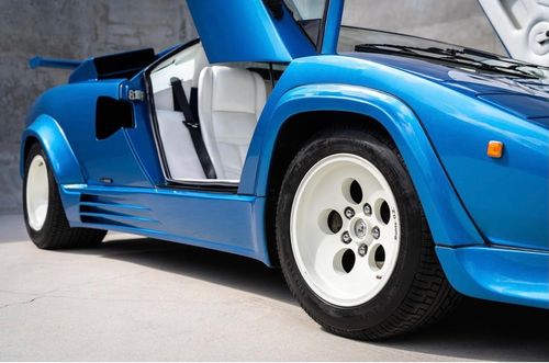 This Lamborghini Countach 5000 Quattrovalvole *JLA12403* was completed on 27 June 1988. It was delivered in the rare and likely unique factory specification of Blu Tahiti (paint code 215854) with a white leather interior and dark blue carpets. From the factory, it was also equipped with white wheels and a sports exhaust system, further enhancing the character of this Countach. Out of just seven Countach Quattrovalvole built in Blu Tahiti, only four were delivered in European specification – making this car exceptionally rare even among its already limited peers.