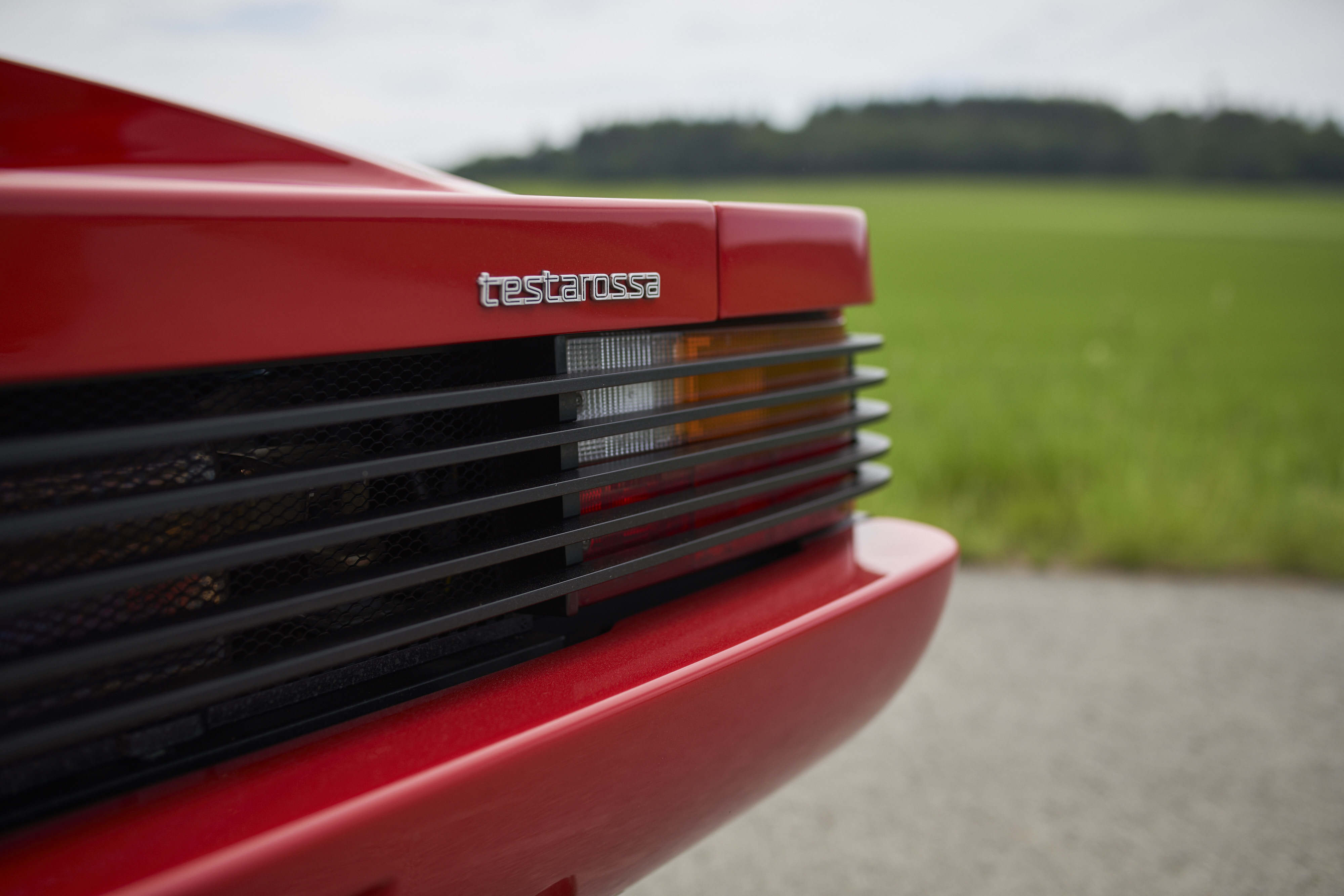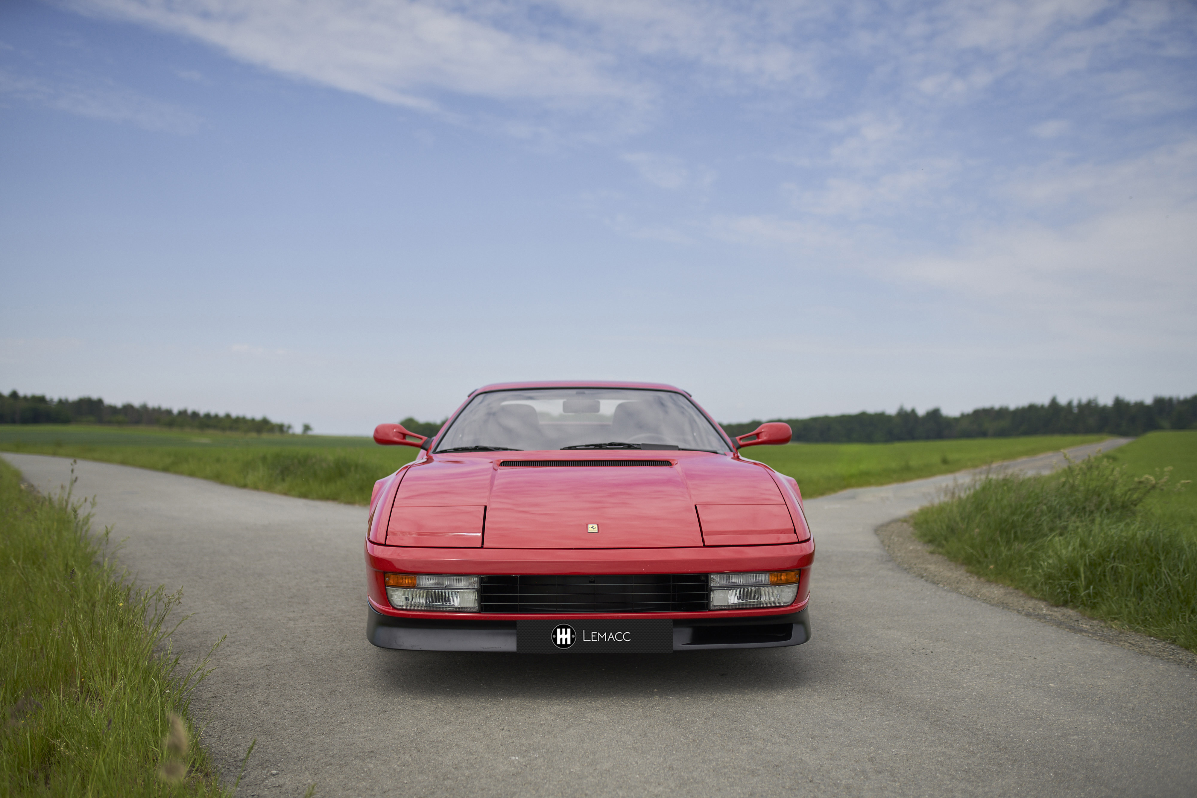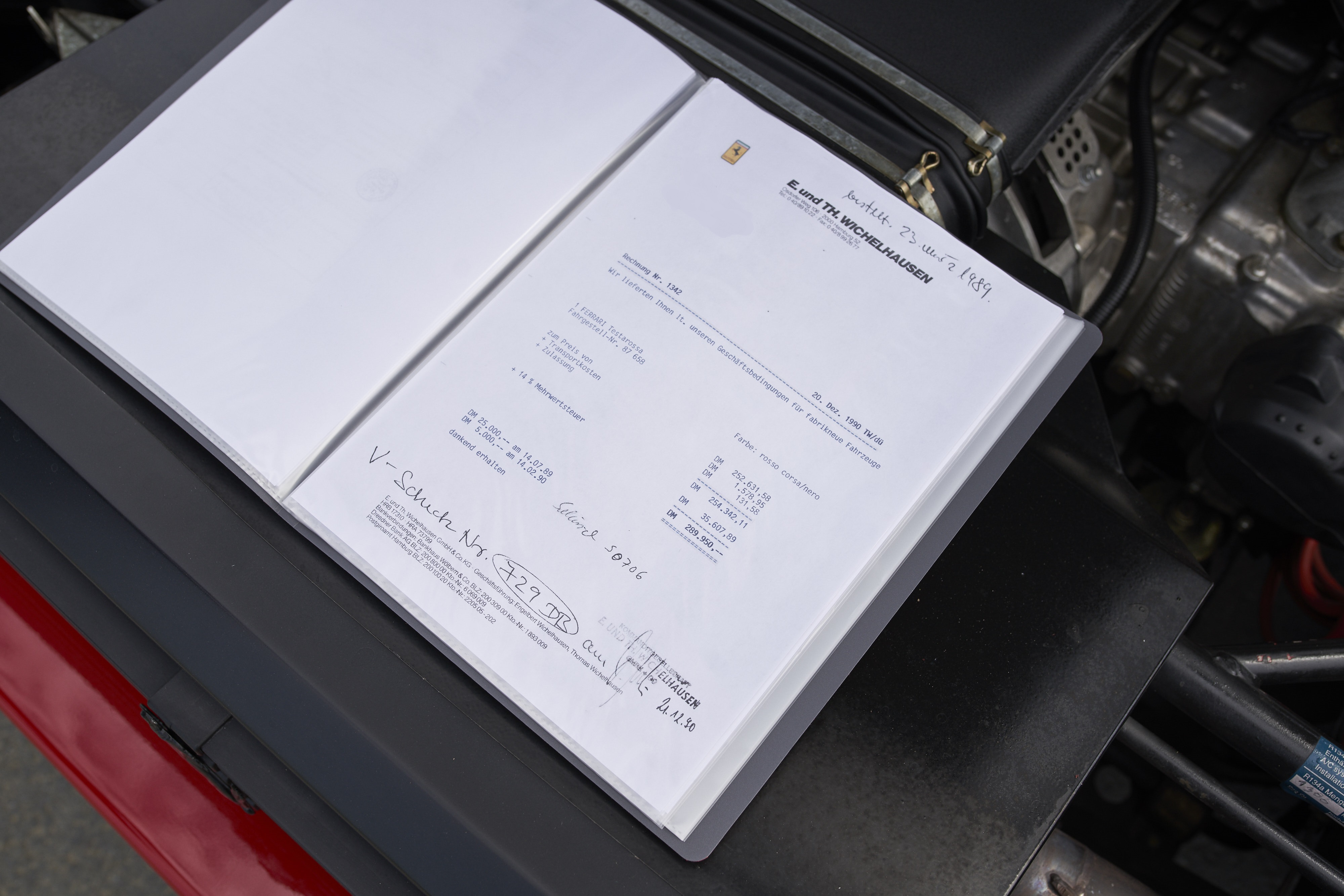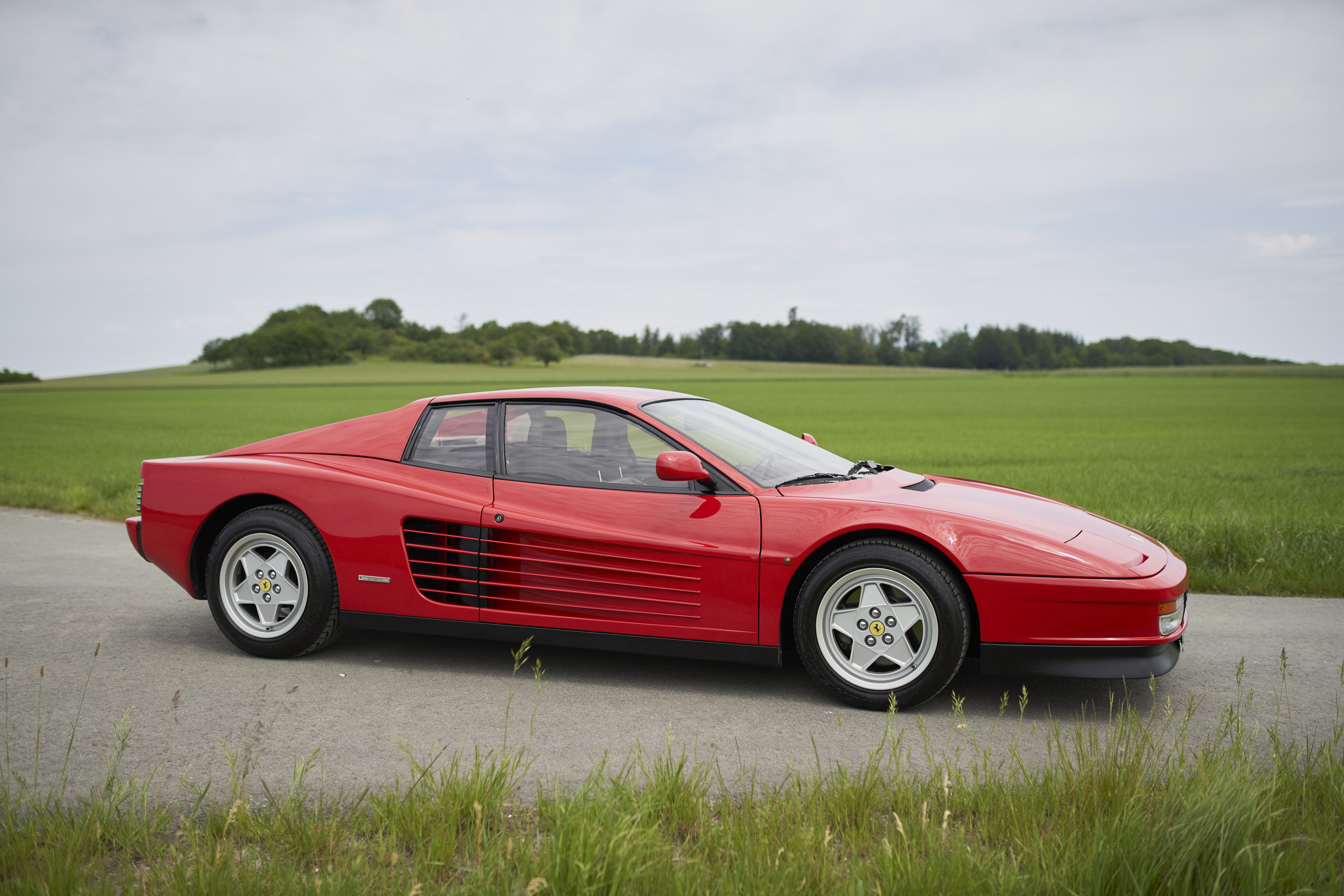 The Ferrari Testarossa with the VIN *ZFFAA17B000087658* was bought on 20th December 1990 thru the Ferrari dealer E. and Th. Wichelhausen from Hamburg / Germany by an owner community as a new car and collector object and certified. The colour combination is rosso corsa - nero. Until the turn of the millennium, the car remained in the private car collection of the owners' association and was regularly moved in order to avoid damage to its condition. During the warranty period, maintenance was carried out at the authorized Ferrari dealership in Hamburg. Afterwards most service work was carried out by the own highly qualified mechanic, who takes care of the remaining vehicles of the collection. In the year 2000 the owner community was dissolved, and the vehicle was completely transferred to the then co-owner (all provable). Invoices from Ferrari authorized workshops are available. The last maintenance was carried out in April 2019 by a workshop specialized in Ferrari. The current mileage is 18,250 km and can be documented. The overall condition can be described as excellent. The original paint is in very good condition, the interior is original and shows no signs of wear. The leather pouch with the owner’s manual, service booklet, tool kit, jack bag and 2x keys and the new car invoice at that time is present. The original, unused 6-piece Schedoni Testarossa luggage set is in black leather and included with the purchase of the vehicle.