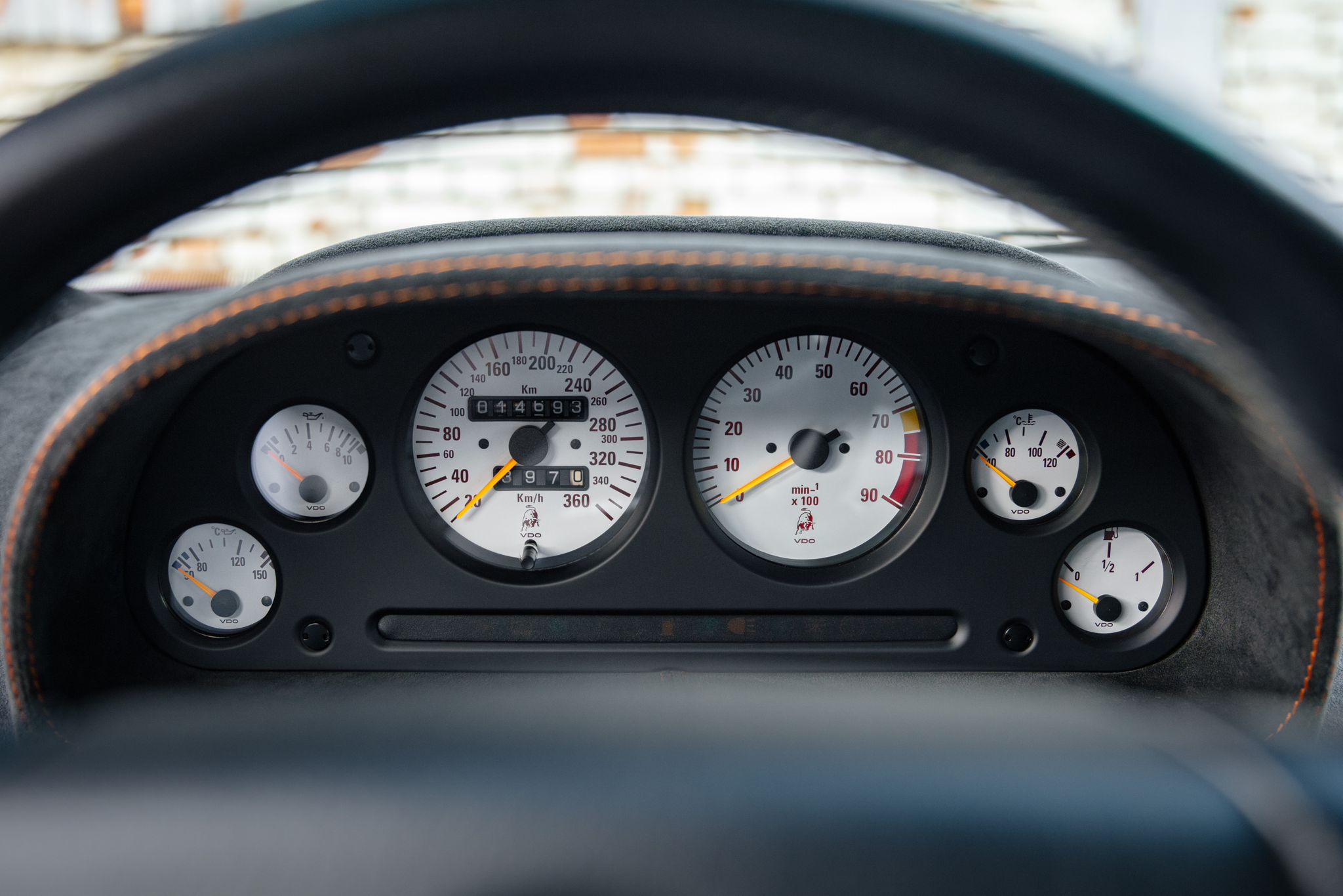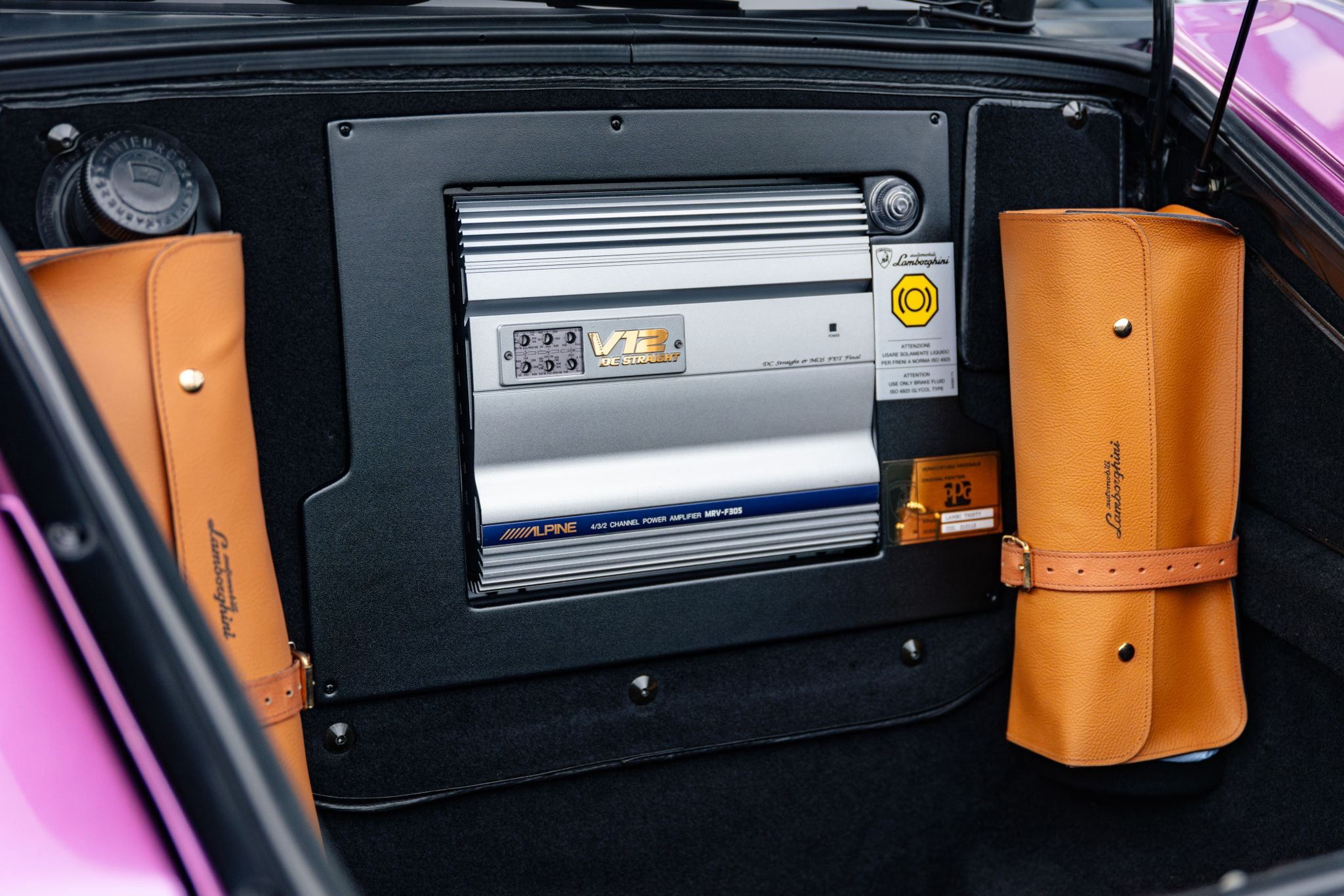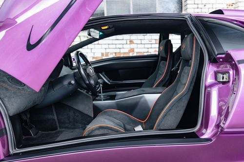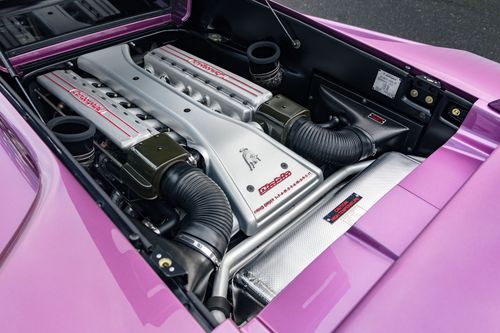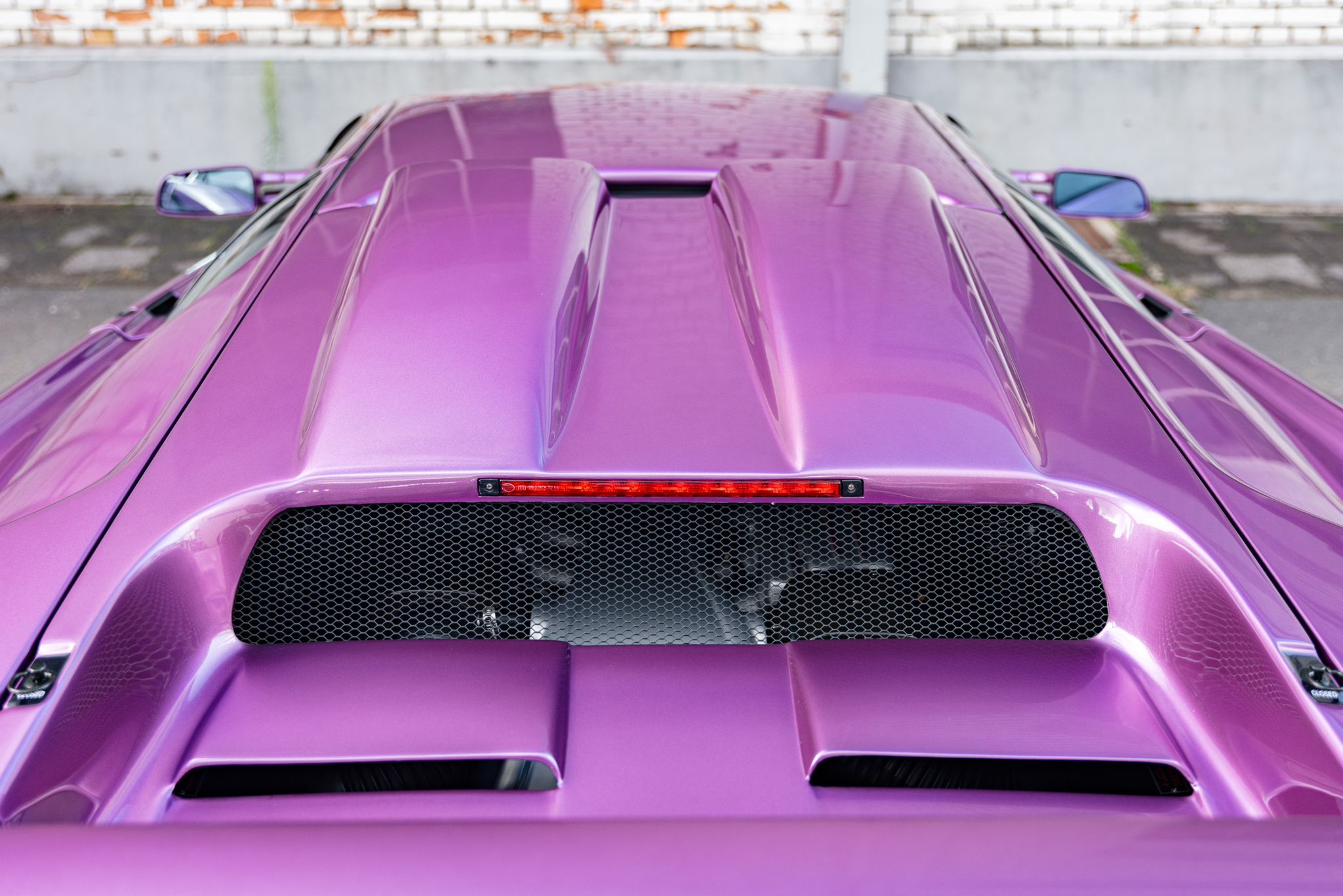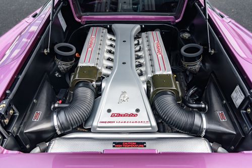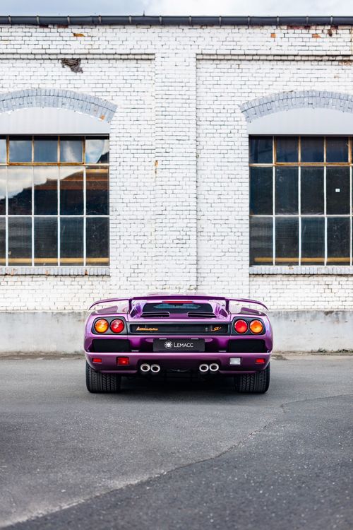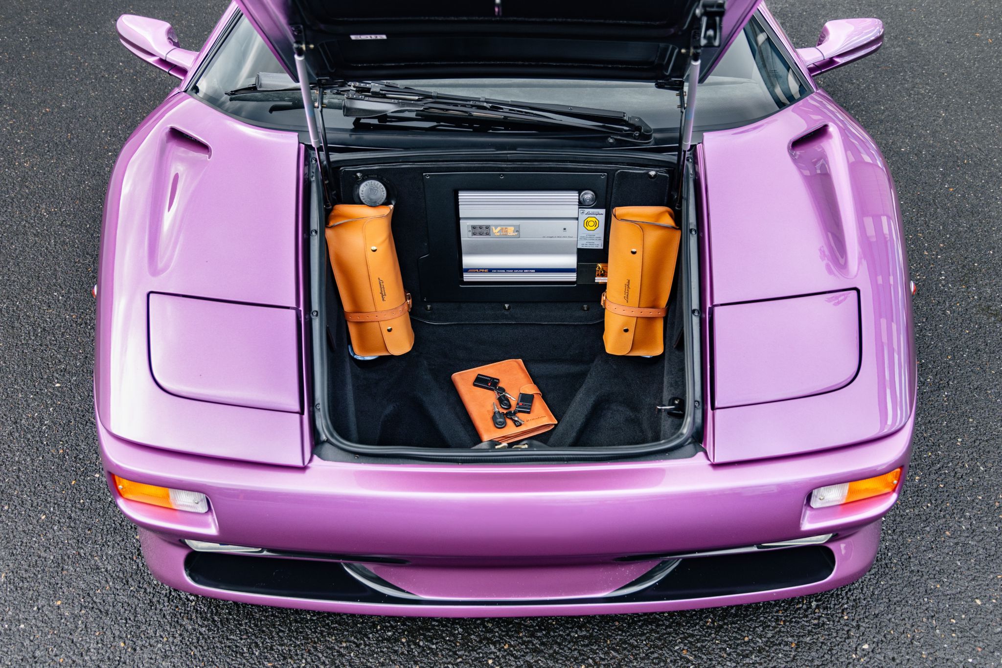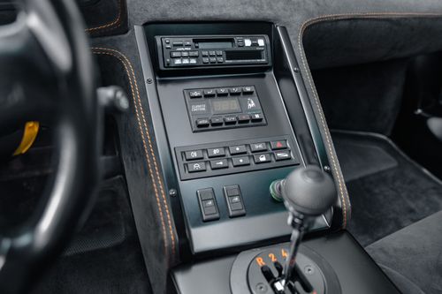 Most Diablo SVs were equipped with matte black interior panels and finished in Alcantara, emphasizing the car’s purposeful, performance-focused character. Many examples were delivered in yellow, blue, red, and white. Distinctive features include the black rear wing and a purpose-built engine cover incorporating twin scoops to channel air directly to the air filter boxes.