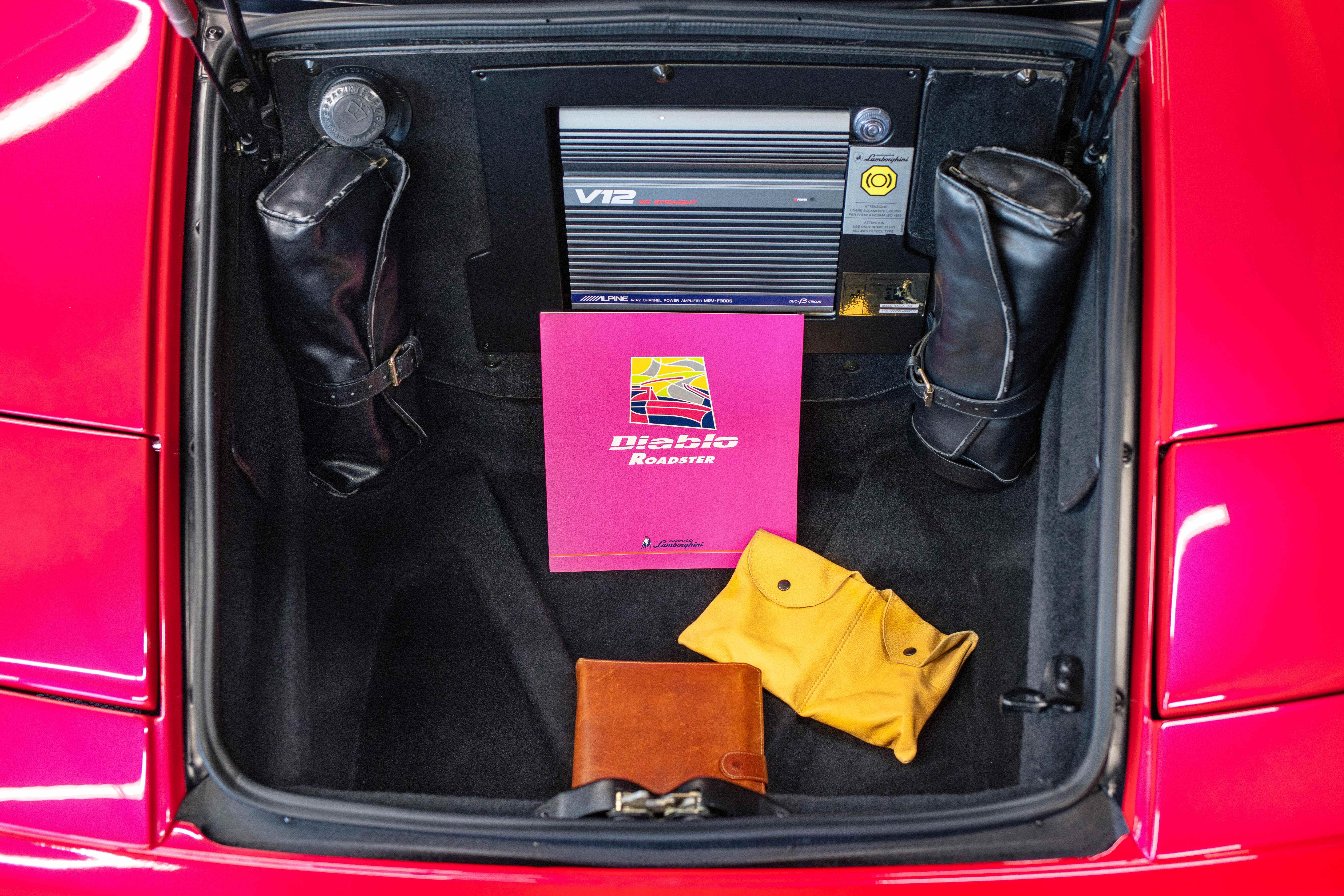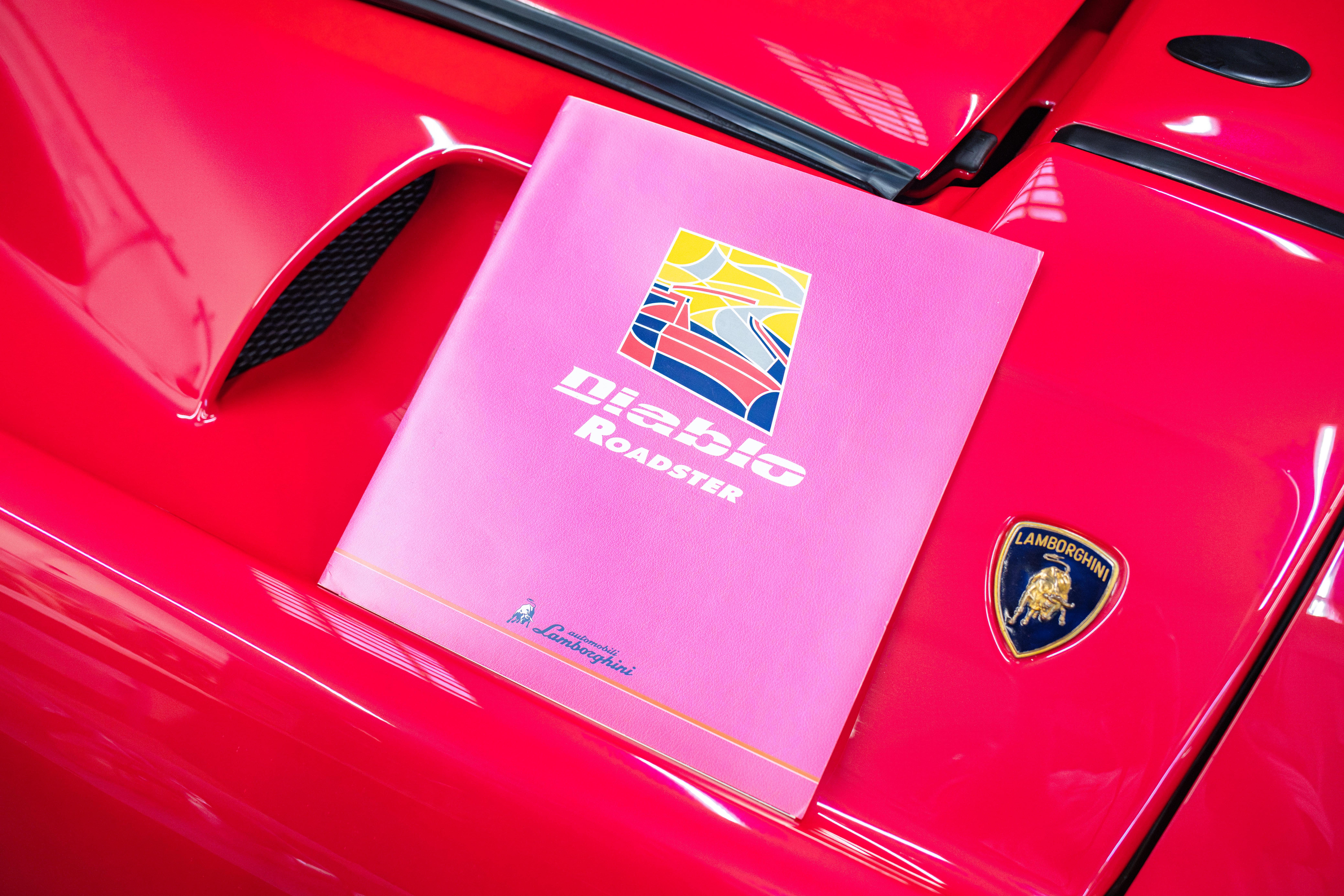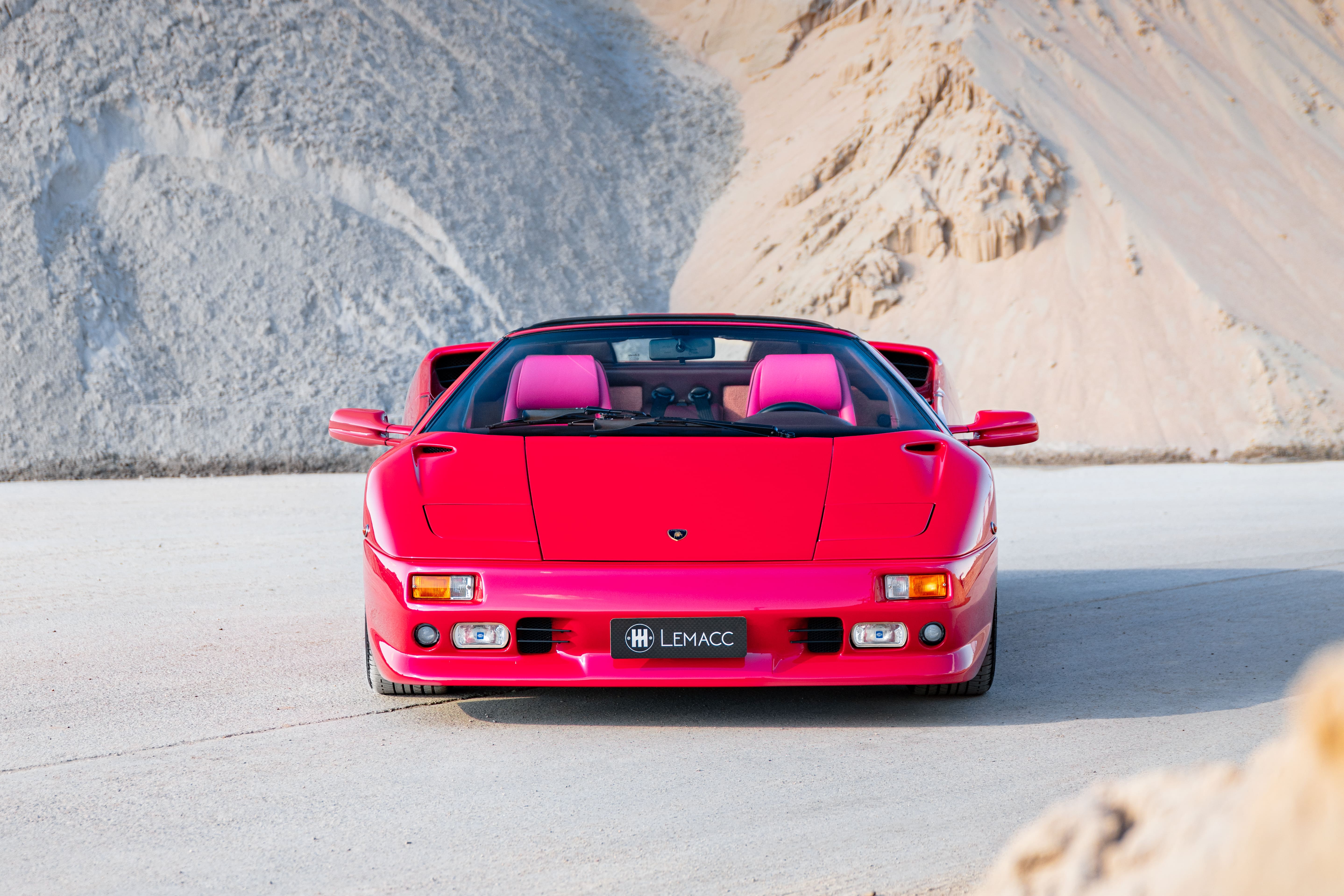 This Lamborghini Diablo VT Roadster features the striking presentation colour combination: exterior in Rosso Targa with a Vinaccia & Fuchsia interior.