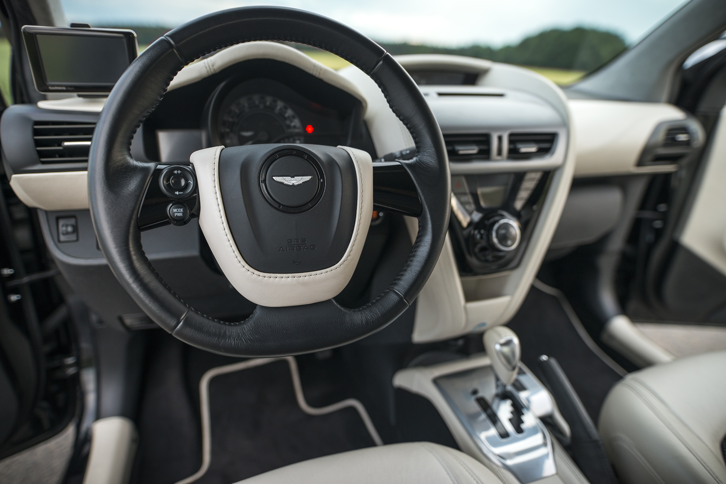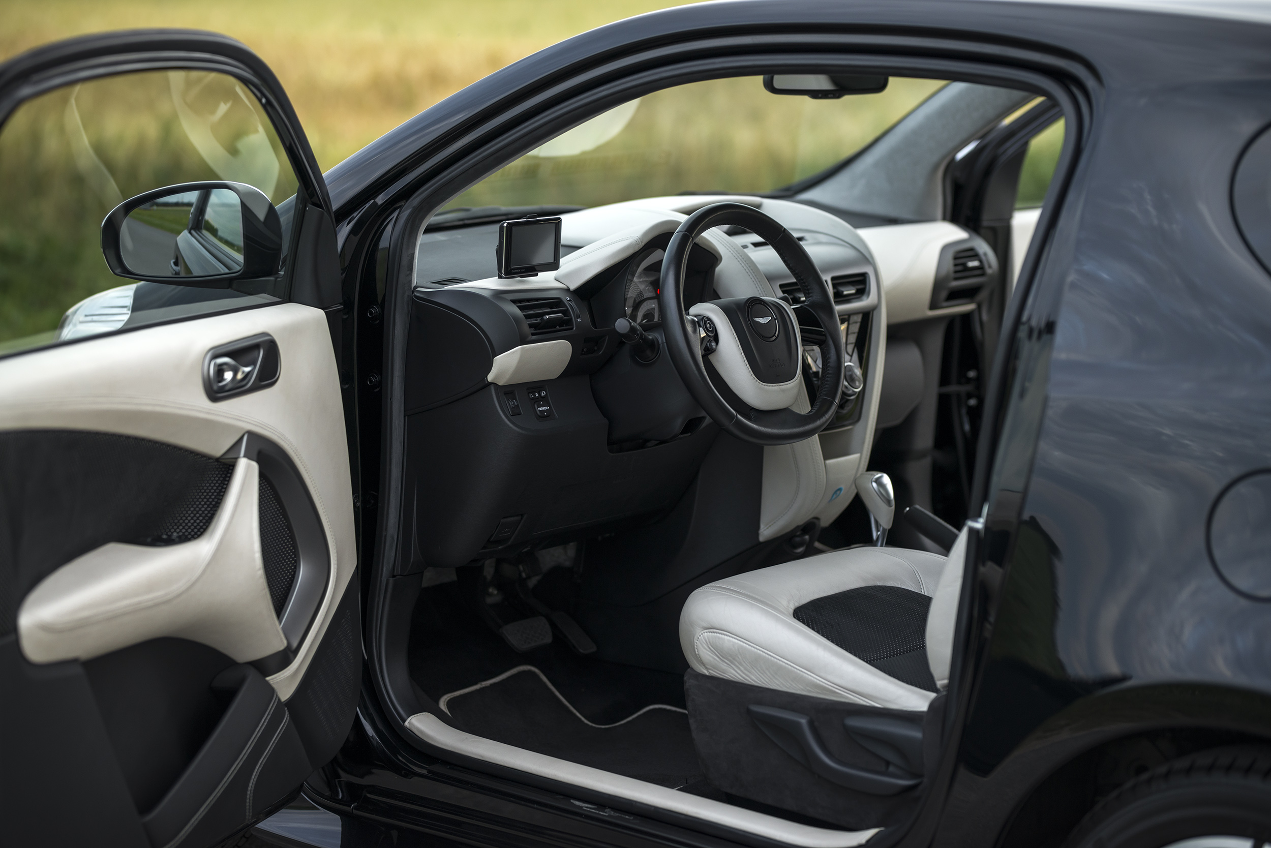 The Aston Martin Cygnet with chassis number *JTNMH11030J006590* was delivered new to Aston Martin Automobile GmbH in Munich, Germany. This particular example is one of just 35 units produced as the exclusive “Black Launch Edition.” Its special specification is immediately recognizable: a black metallic exterior accented by two matte black stripes running centrally along the body. The interior of the “Black Launch Edition” features pearl white leather upholstery, complemented by black Alcantara seat inserts, black carpets with pearl white piping, and a grey headliner.